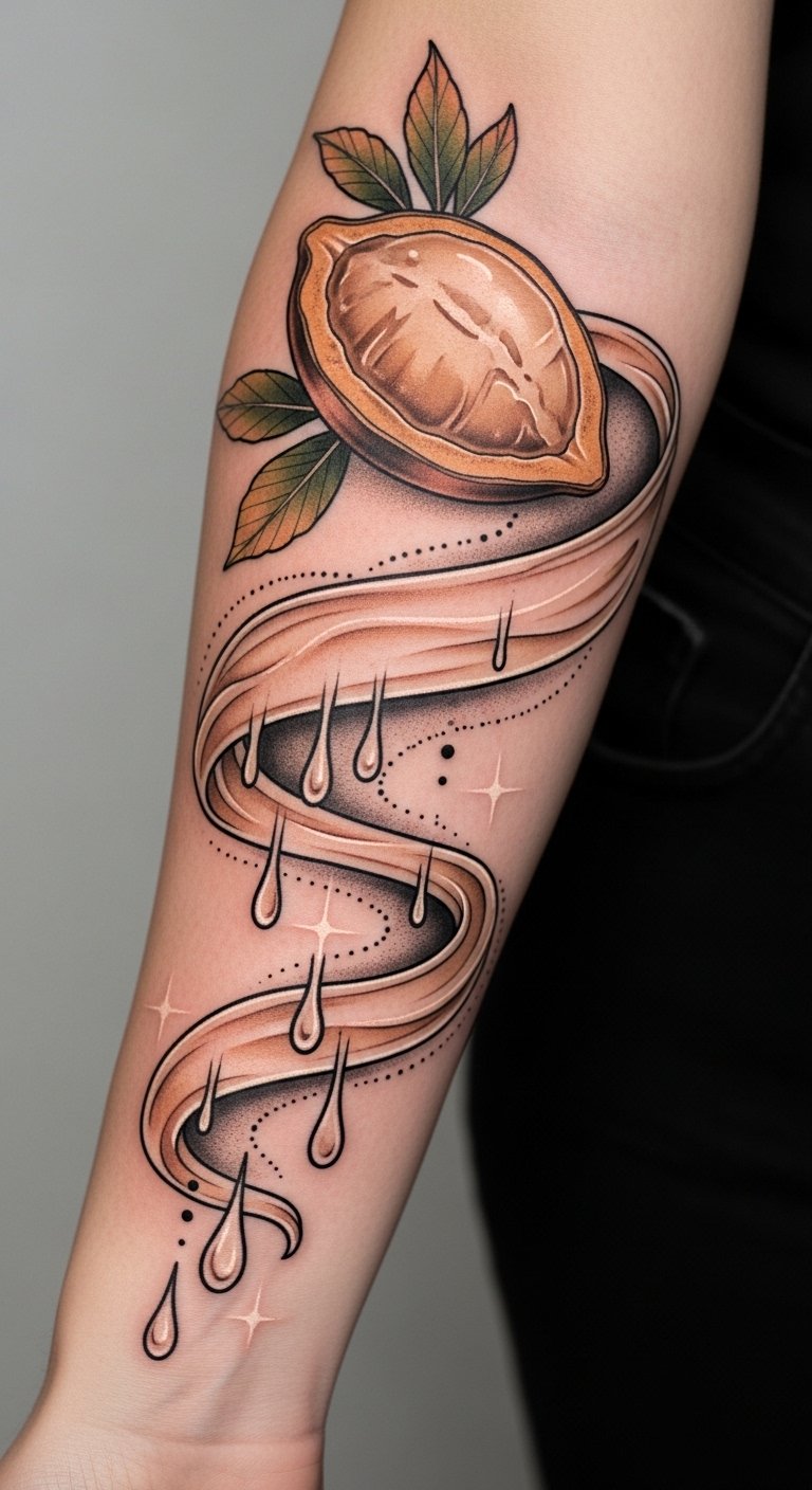 The design symbolizes protection and nourishment—the capsule as guardian energy, the coconut as natural renewal—evoking calm confidence and lasting self-expression; ideal on the outer forearm where it reads clearly and can be shown or covered as desired.
