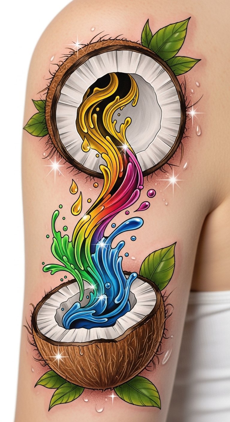 Regular application helps maintain those bold hues, so your ink stays stunning and true to life, allowing your expression to shine freely. This design symbolically blends the nourishing coconut with flowing ink to represent care and longevity; the healing leaves and glowing highlights evoke rejuvenation and protection, while the oil-to-ink transition expresses transformation and artistic preservation.