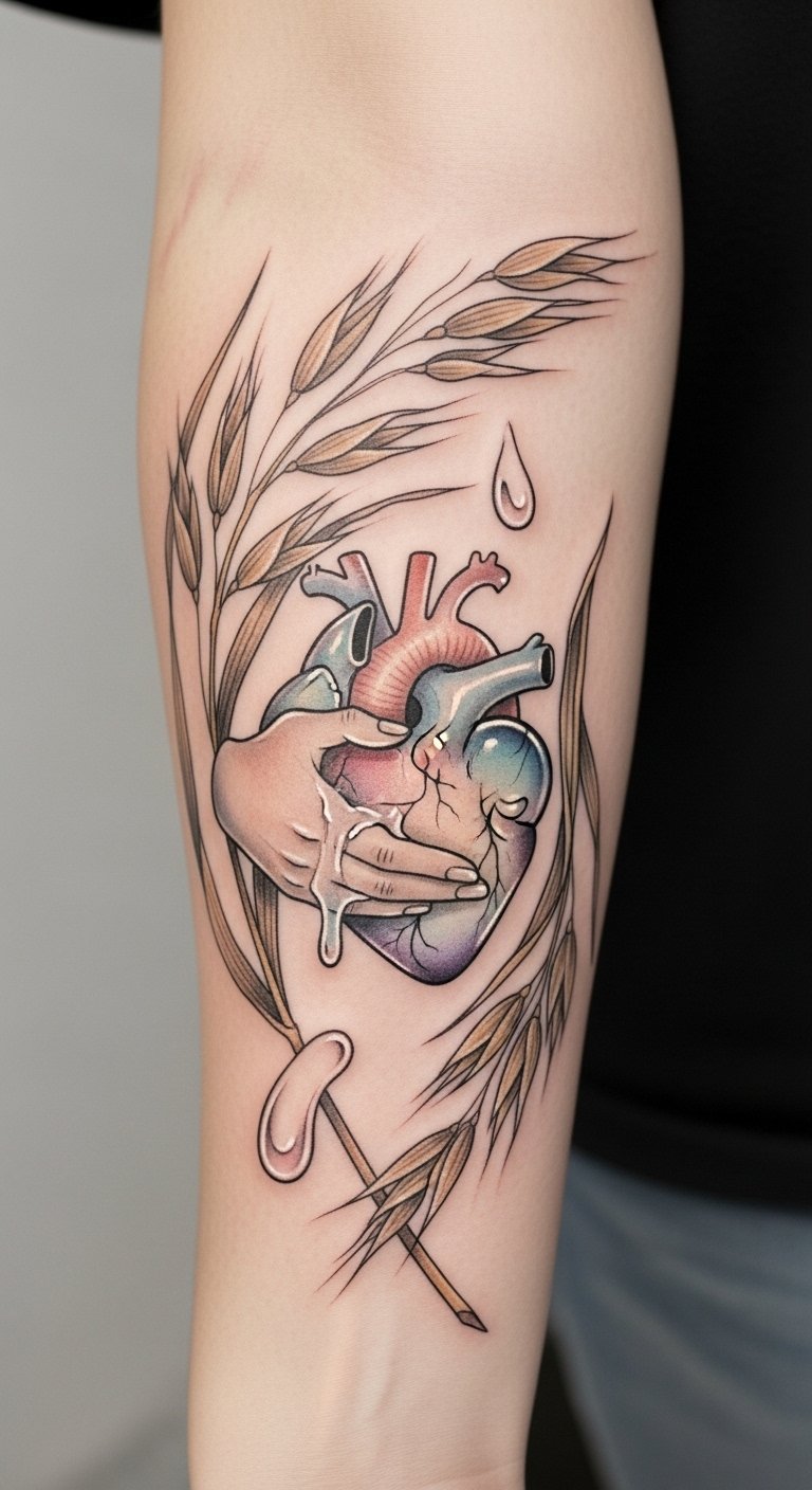 This design symbolizes restoration and resilience, evoking calm confidence as the crystalline stalks cradle the healing mark; place it along the forearm or ribcage where the plant’s vertical growth complements the body’s natural lines, conveying protection, renewal, and a quiet reverence for the body’s regenerative power.