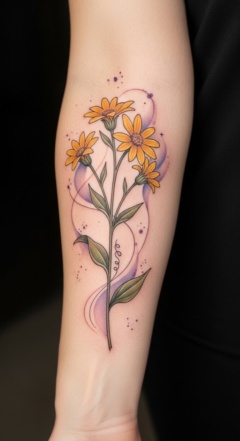 A flowing sleeve design that weaves realistic sunflowers with soft golden oil droplets morphing into gentle waves of abstract healing energy; incorporate delicate anatomical elements of skin layers stylized as protective petals and small botanical motifs (calendula, chamomile) threaded through; tonal palette of warm yellows, muted greens, and soft amber highlights; fine-line detailing with watercolor shading to convey soothing warmth and recovery. Symbolically the sunflowers represent resilience and nourishment, the oil droplets embody calming restoration, and the protective petal layers suggest care and healing; emotionally the piece evokes comfort, renewal, and quiet strength. Ideal placement is a forearm sleeve or side rib where the flow can wrap and be seen during aftercare rituals.
