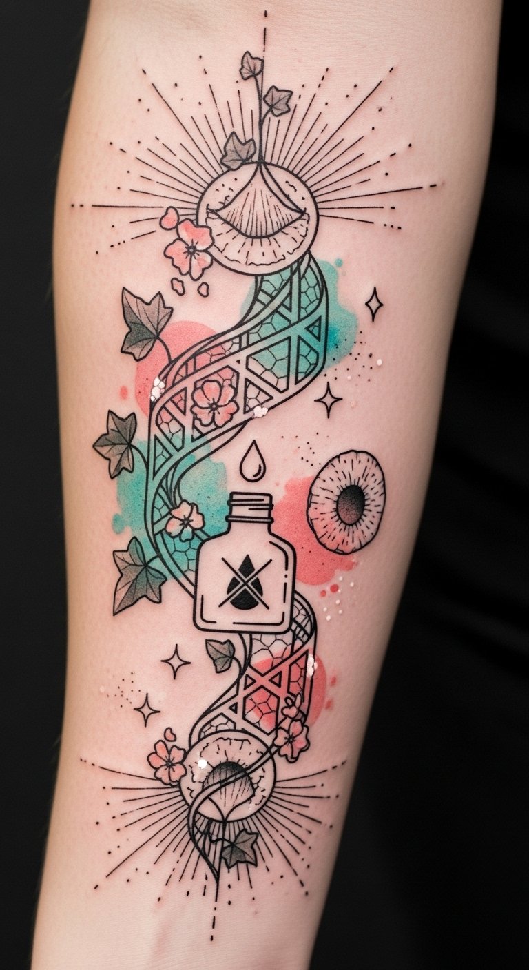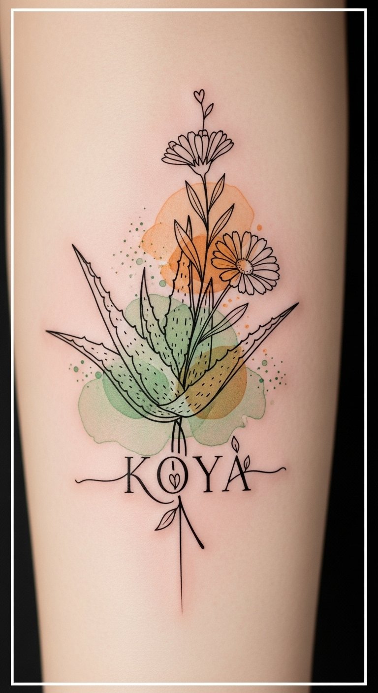 This design symbolizes the journey of healing and care after getting inked—each tiny bottle represents an essential step in nourishing skin and preserving vibrancy, the vine connecting them shows continuity and the ongoing nature of aftercare. Aloe leaves and oil droplets evoke soothing and protection, while soft watercolors and warm tones convey comfort and tenderness. Placed along the inner forearm, the piece reads like a personal guide visible to the wearer, offering reassurance and a reminder of the attention that keeps both skin and art healthy.