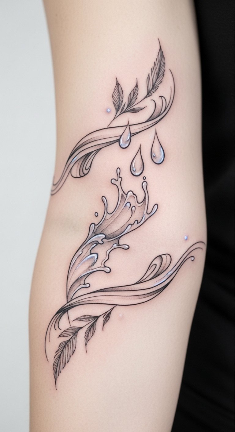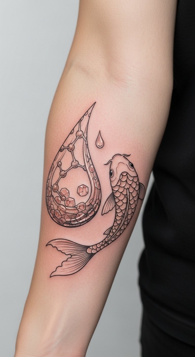 The droplet flowing into the koi conveys soothing motion and renewed life for dry skin. Place this on the outer forearm so the imagery is visible during care routines, offering a calming visual reminder of maintenance and the emotional reassurance of healing.