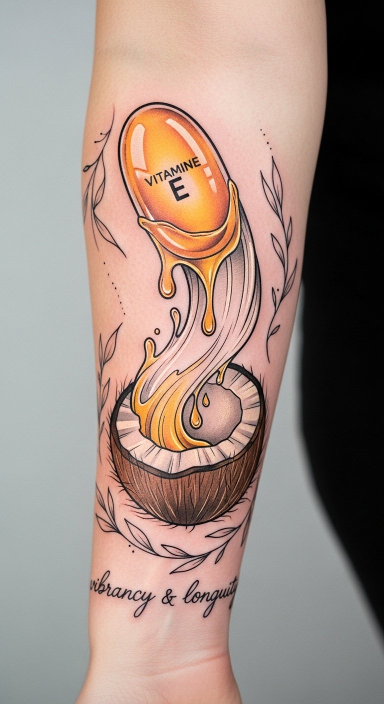 Vitamin E and coconut oil are two powerhouse ingredients that can greatly enhance the vibrancy and longevity of your tattoo. They work together to lock in skin hydration, preventing dryness that can fade your ink.