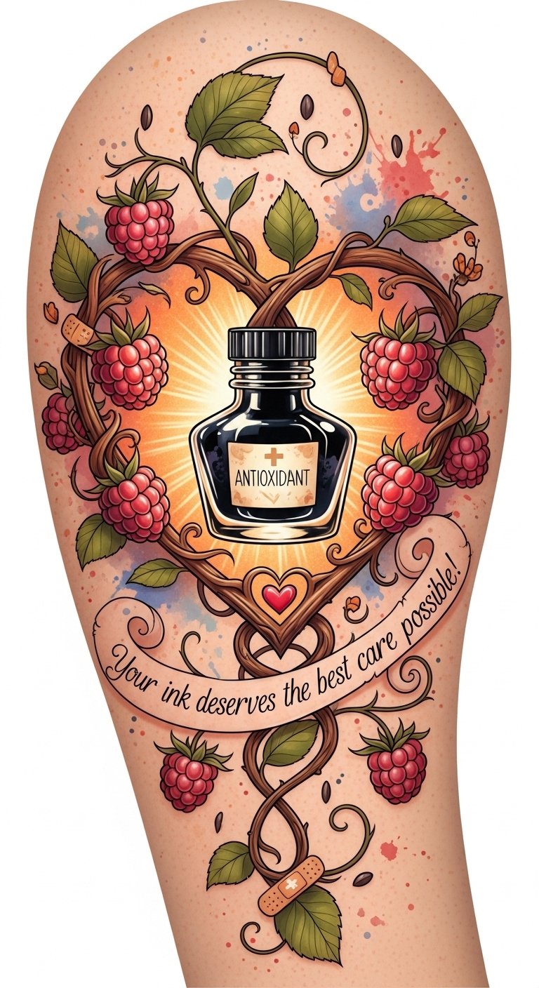 Raspberry branches shaped into a heart cradle an ink bottle, symbolizing protection and nourishment: the berries and seed motifs represent the antioxidant benefits that shield ink from fading, while the golden glow suggests neutralizing free radicals and promoting healing.