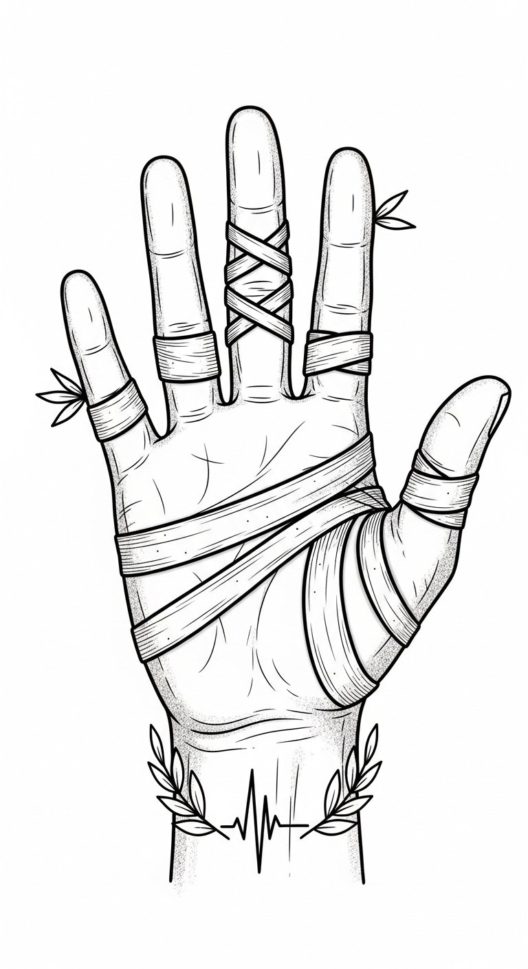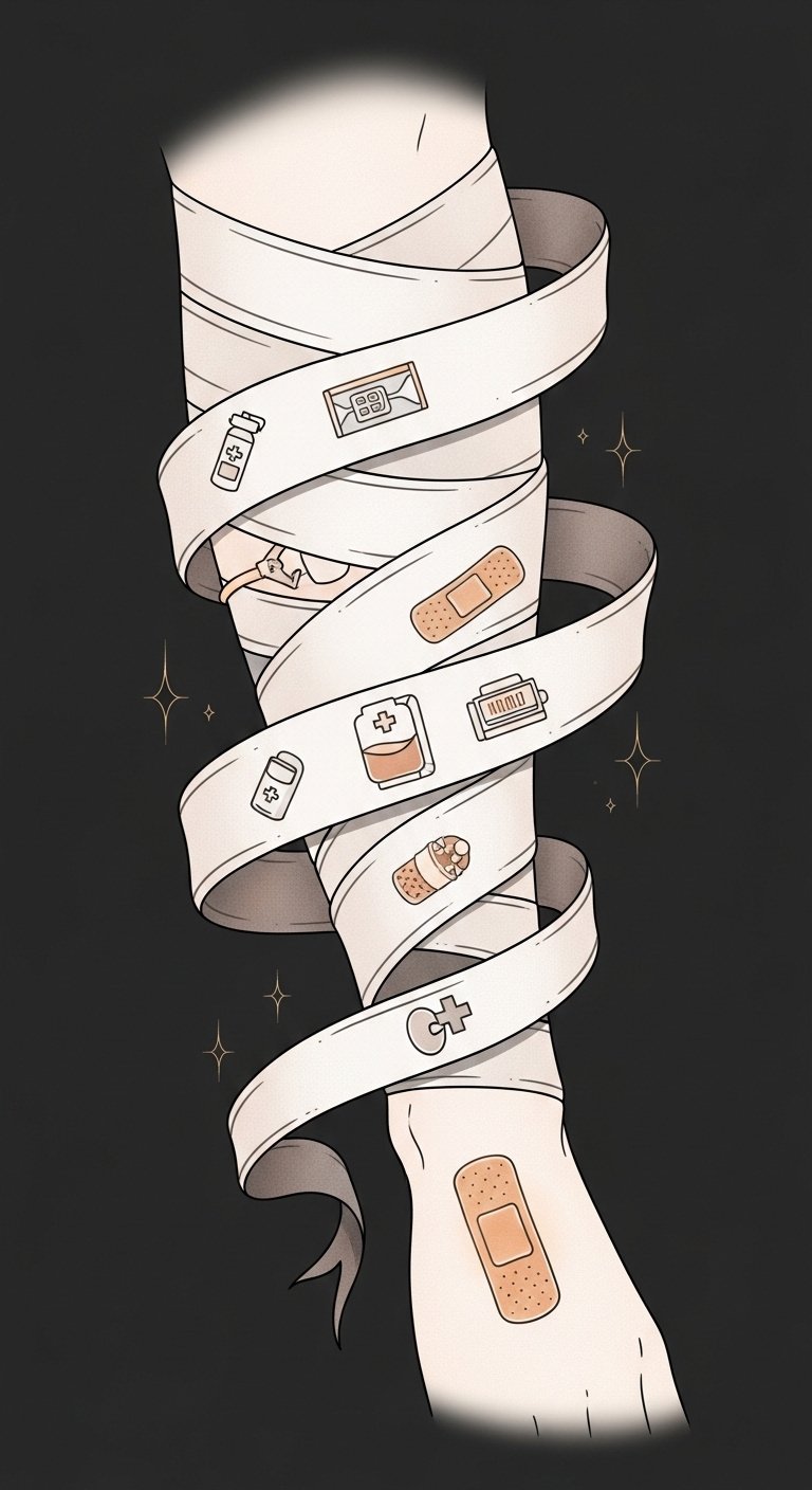 This design symbolizes resilience and functional protection—tape and wrap imagery represents care, prevention, and ongoing support for the body.