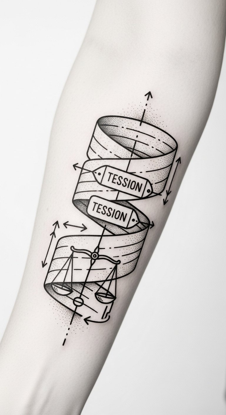 A tattoo design that weaves together imagery of layered cohesive wraps—each band labeled with tiny, subtle brand glyphs—forms a cuff around a forearm, alternating flexible, flowing ribbons with rigid, geometric bands to represent material differences. Small magnifying glass and checklist icons nestle among the wraps to symbolize comparison and informed choice; a faint compass motif underscores empowerment and freedom. The emotional tone is confident and pragmatic, celebrating personalization and mastery; ideal placement is the outer forearm or calf where the cuff can be viewed easily and read like a visual guide.