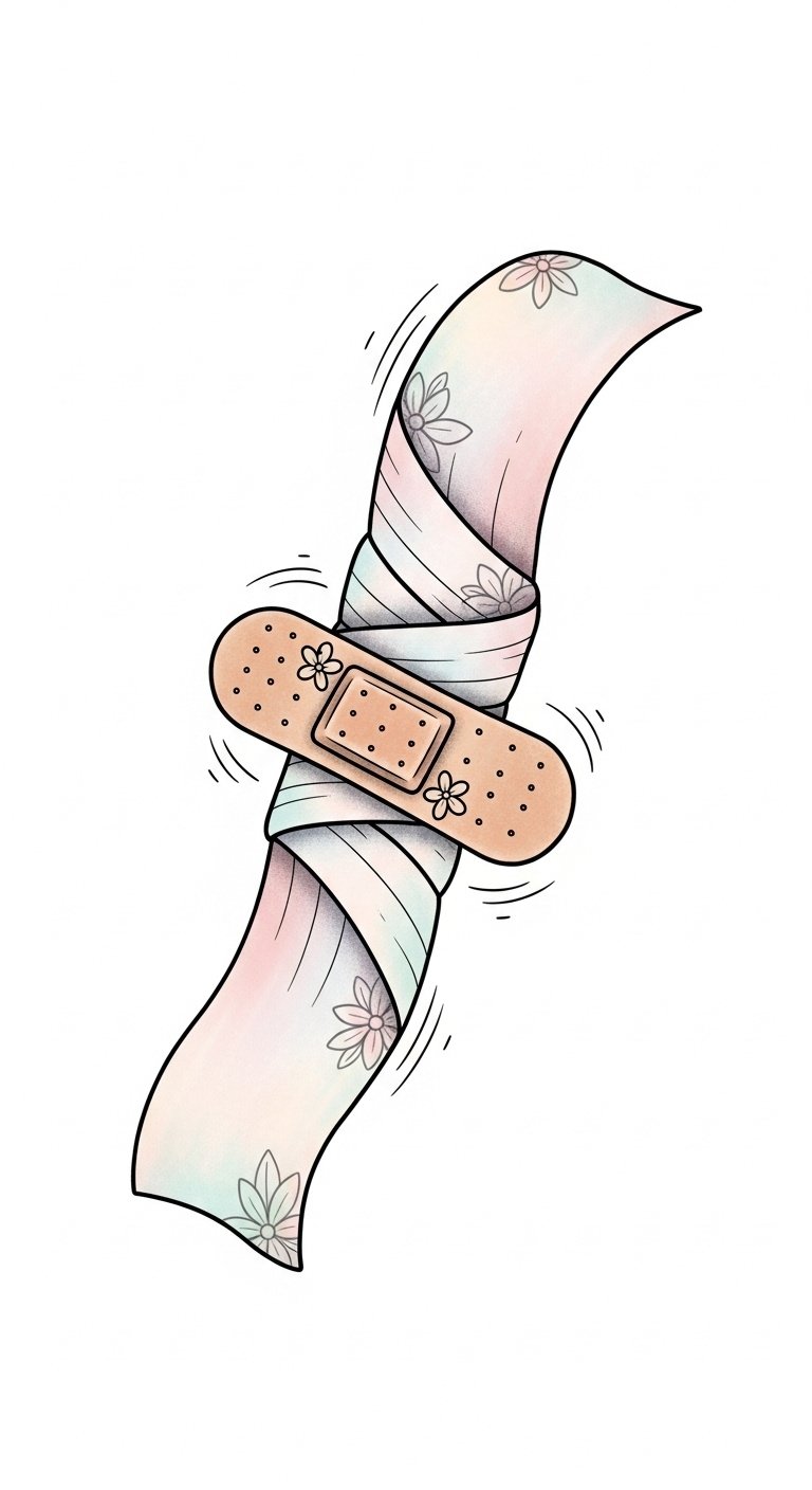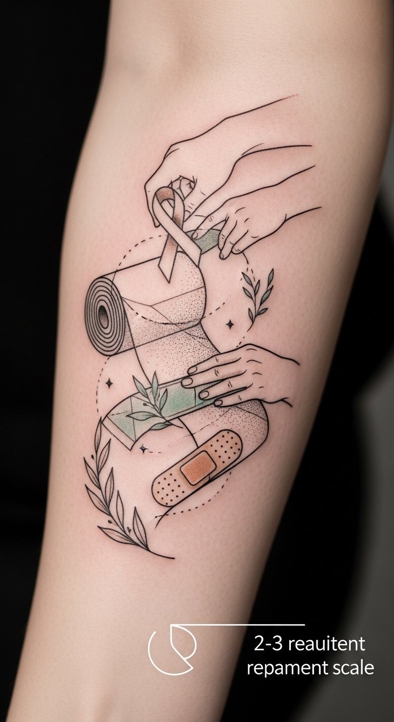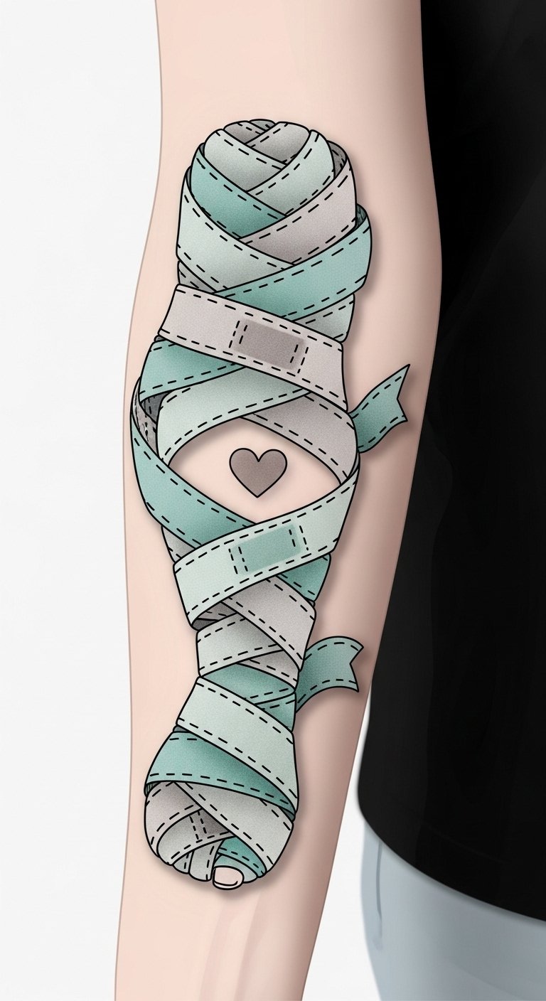 To symbolize stability and care, the design uses the cohesive wrap curling snugly around the gauze to represent a firm yet gentle hold that minimizes movement while promoting healing; pastel tones and tiny floral accents evoke comfort and the nurturing aspect of protection without the harshness of adhesives, while motion lines convey allowed freedom of movement. Ideal placements include the forearm or shoulder for visibility and reassurance, or the upper thigh for a more private, healing-focused placement, with scale adjusted so the wrap appears supportive rather than constrictive.
