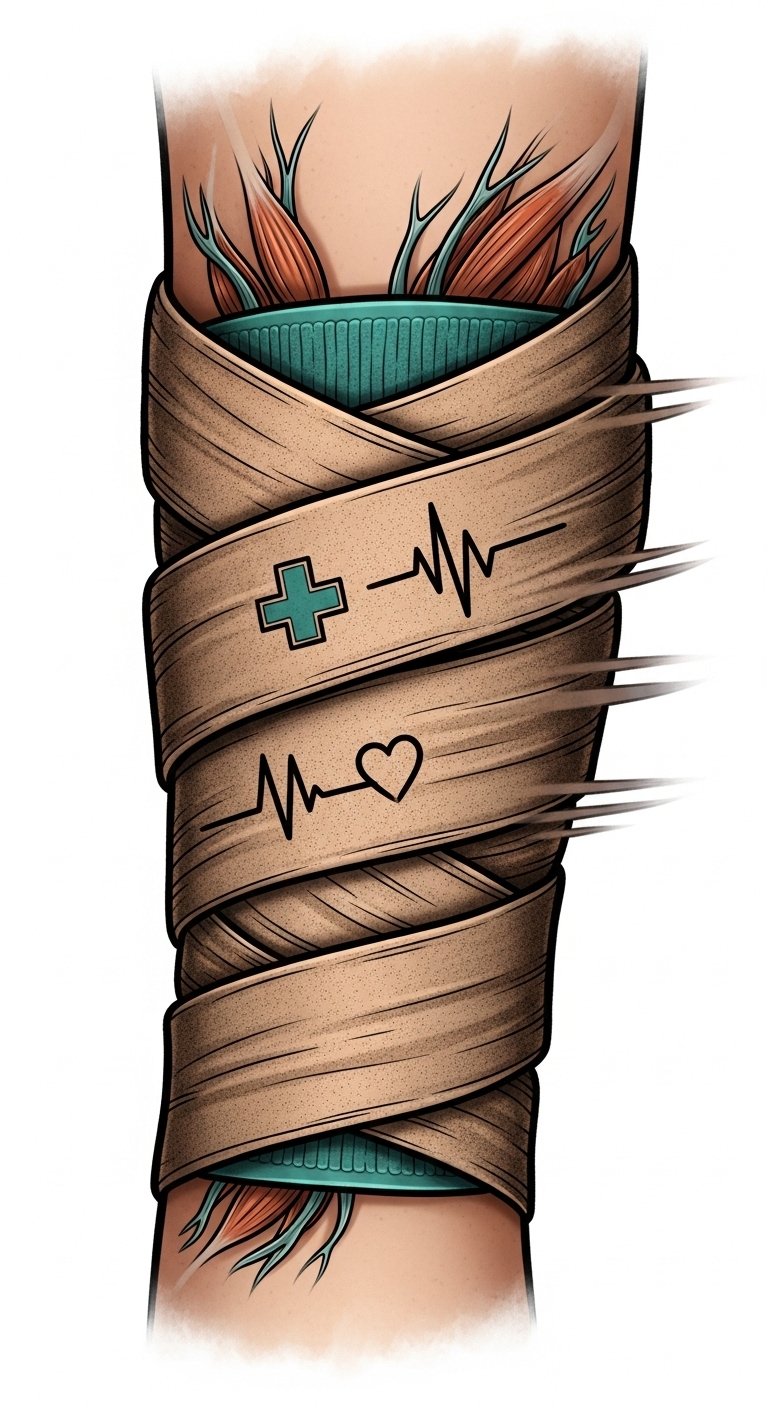 A forearm wrap-style tattoo that visually interprets the literal safety instructions into symbolic elements: clean, precise lines and negative-space banding represent “cleanliness and proper technique”; a subtle anatomical sketch of a hand with shaded pressure points and a magnifying glass motif stands for “injury assessment” and “skin sensitivity”; layered translucent ribbons echo “layering techniques” and a small hourglass denotes “wrap duration”; micro-patterns of skin-safe icons (soap, shield, first-aid scissors) symbolize “hygiene” and “easy removal” for emergencies. The composition uses muted clinical tones with a single bright accent color for the cautionary elements, conveying vigilance and care. Ideal placement is the inner forearm or calf where the banded design can wrap naturally and remain visible to the wearer as a reminder to “stay aware, stay safe.”