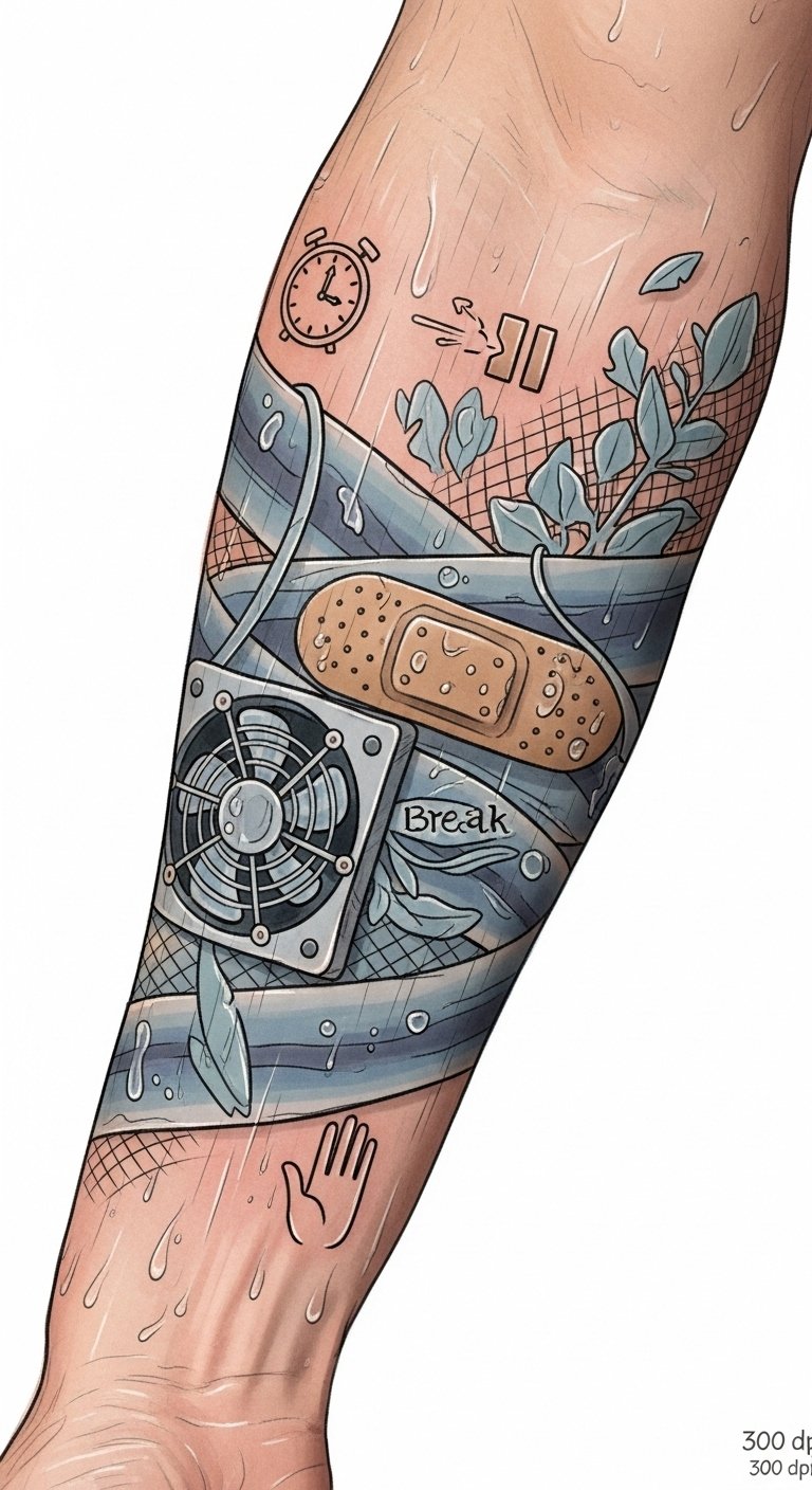 When inked, the design merges practical resilience and self-care: the cohesive wraps represent protection and grip in adversity, micro-droplets and sweat sheen acknowledge the realities of challenging conditions, while the fan and mesh motifs symbolize the breath of relief and ventilation. The pause clock and open palm are gentle reminders to rest and reconnect with the body, infusing the piece with calm determination. Best placed along the forearm or calf, the tattoo reads as a personal mantra—functional, mindful, and quietly empowering.