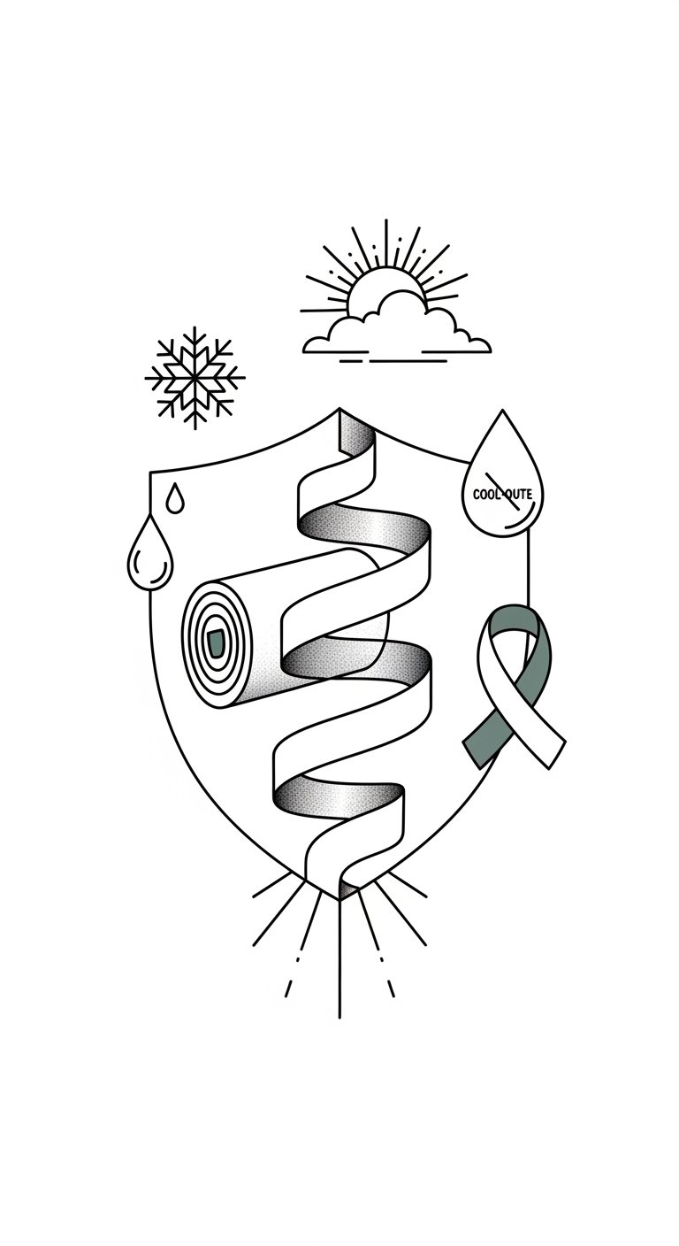 A compact, ribbon-like band encircling the forearm, illustrated as a series of interlocking wrap segments that visually transition from crisp, rolled edges to gently worn textures; subtle icons—thermometer, water droplet, and a small physician’s hand—are integrated into the pattern, and fine script phrases from the prompt are woven along the inner edge. This design symbolizes care, maintenance, and resilience: the rolled segments represent best practices and discipline, the wear marks acknowledge vulnerability and the need for renewal, while the protective icons evoke vigilance against heat and moisture. Ideal placement is the outer or inner forearm where the band can be seen easily as a reminder to preserve functionality and longevity, conveying a calm, practical emotional tone.