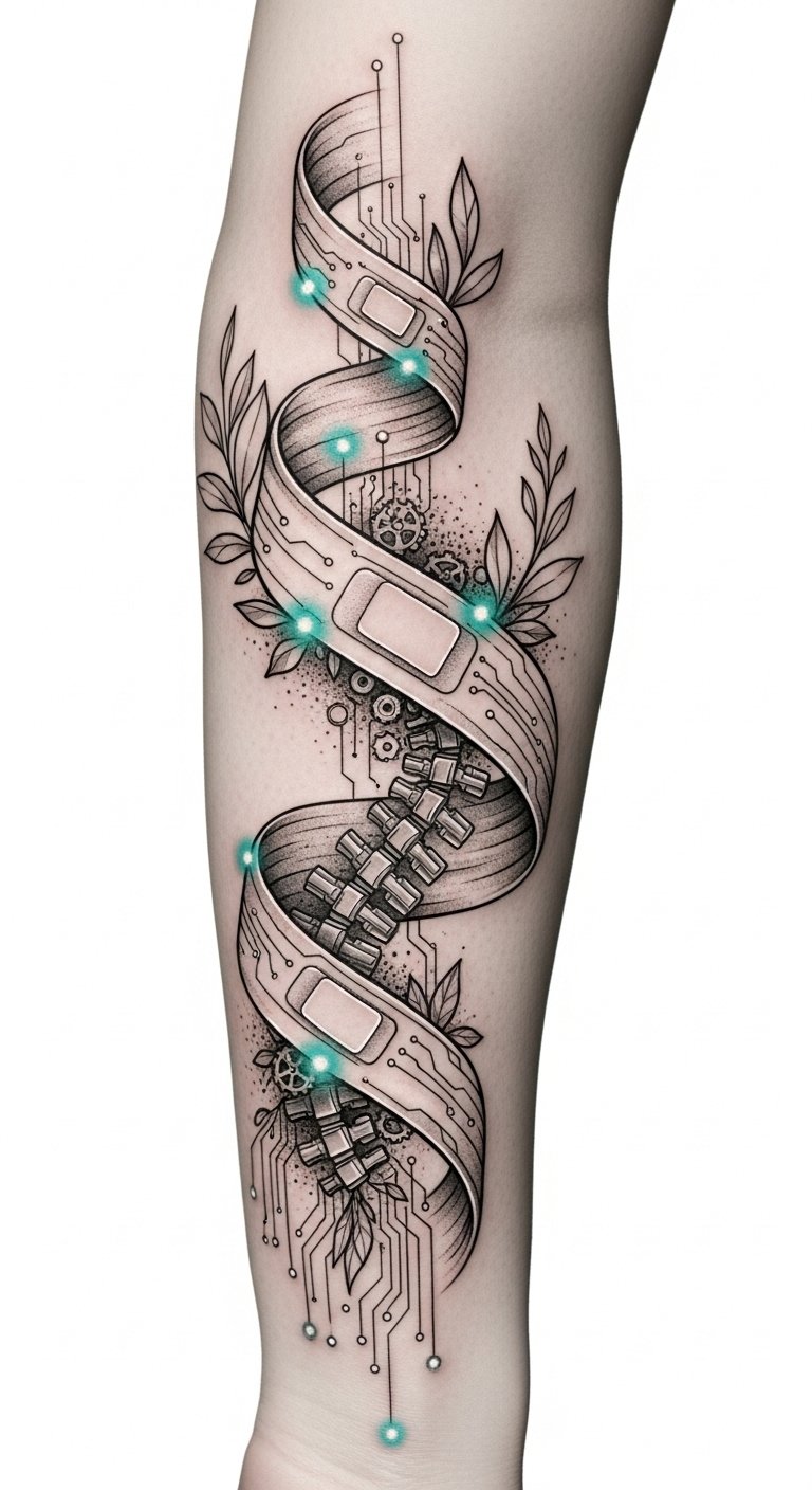 As a tattoo, the design translates the original text’s message of evolving rehabilitation into a visual narrative: the cohesive wrap ribbon embodies support and comfort, while the transition into circuit-like spine elements and microchip gears signals innovation and automated application.