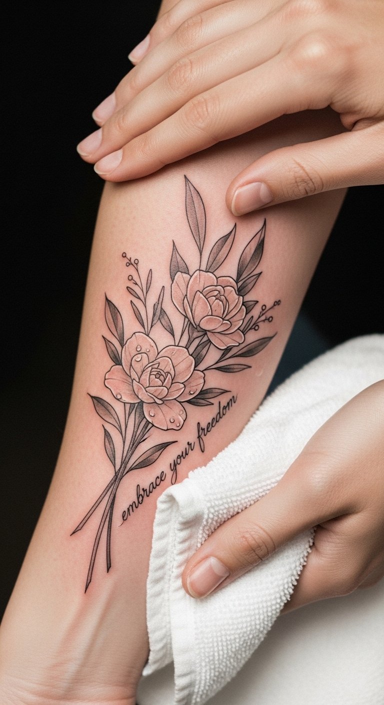 Intended for the inner forearm for visibility and intimacy, the piece balances readability of the text with organic imagery so it acts as both a practical reminder and a personal emblem of preservation and gentle attention.