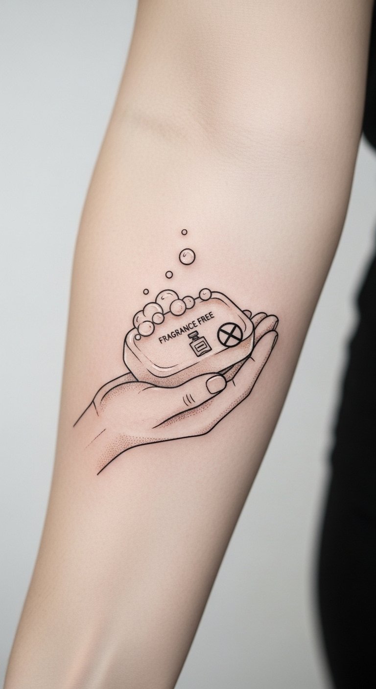 To symbolize care, healing, and protection, this design uses the cradled soap and soothing bubbles to represent the gentle routine that preserves a tattoo’s vitality; the crossed-out perfume icon quietly signals the importance of fragrance-free choices without harsh judgment.