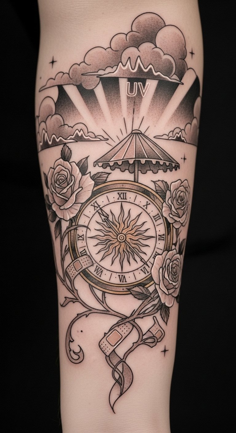 When outdoors, seek shade or cover your tattoo to guarantee it heals beautifully, allowing your body the freedom to recover fully. This design uses the sundial to symbolize time and the careful patience required during healing; bandaged roses represent vulnerability and recovery, while the protective canopy and shaded clouds convey shelter and intentional care.