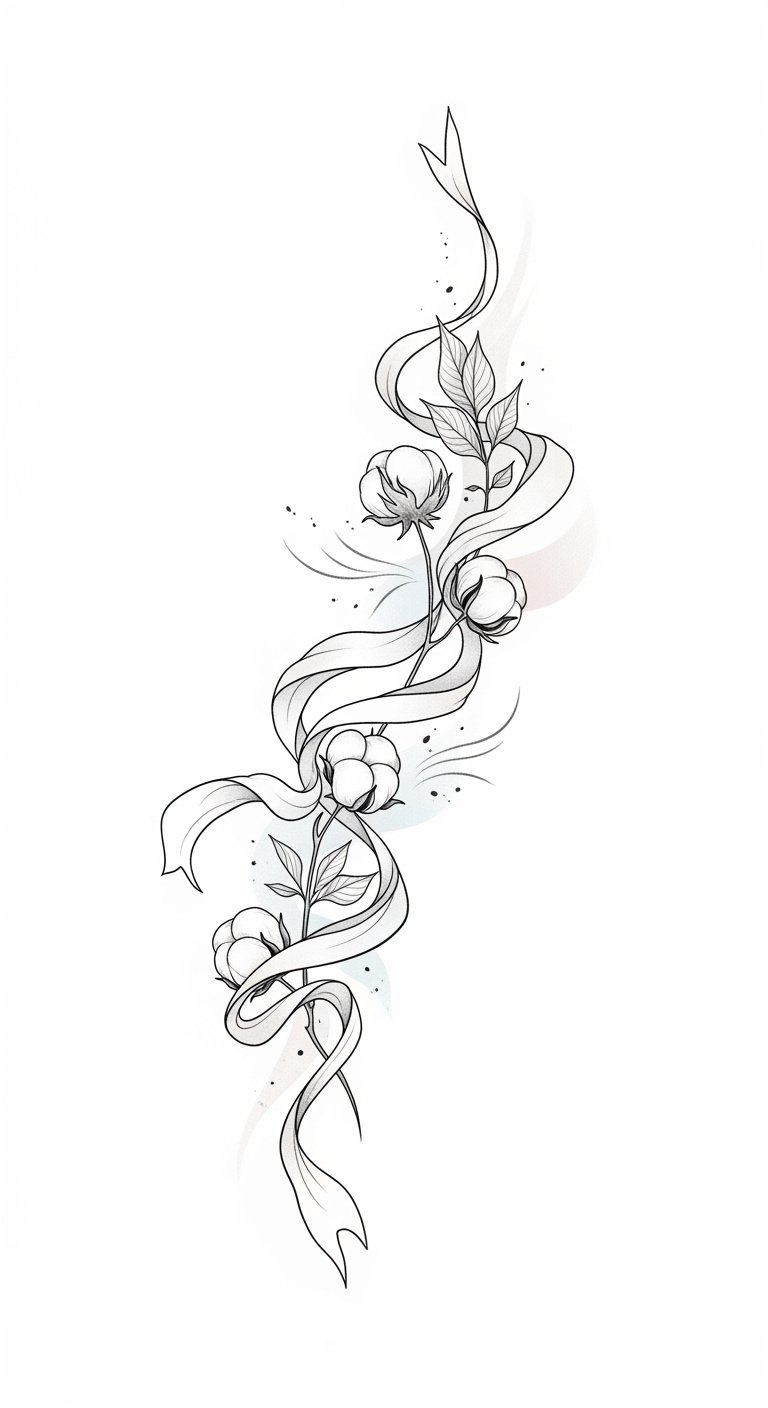 This design symbolizes healing and gentle protection: flowing ribbons represent loose clothing and movement, while cotton and linen leaves evoke breathability and comfort.