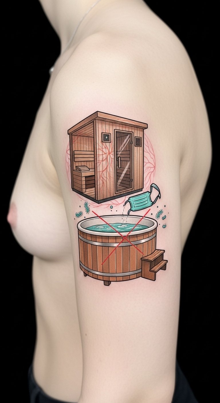 Although it might seem relaxing, skipping saunas and hot tubs is essential for your tattoo’s healing process. The high heat from saunas can increase blood flow, leading to excessive swelling and irritation. Furthermore, hot tubs often lack proper hygiene, exposing your fresh ink to bacteria. Avoiding these sauna risks guarantees your tattoo heals beautifully, allowing you the freedom to flaunt your art without worry.