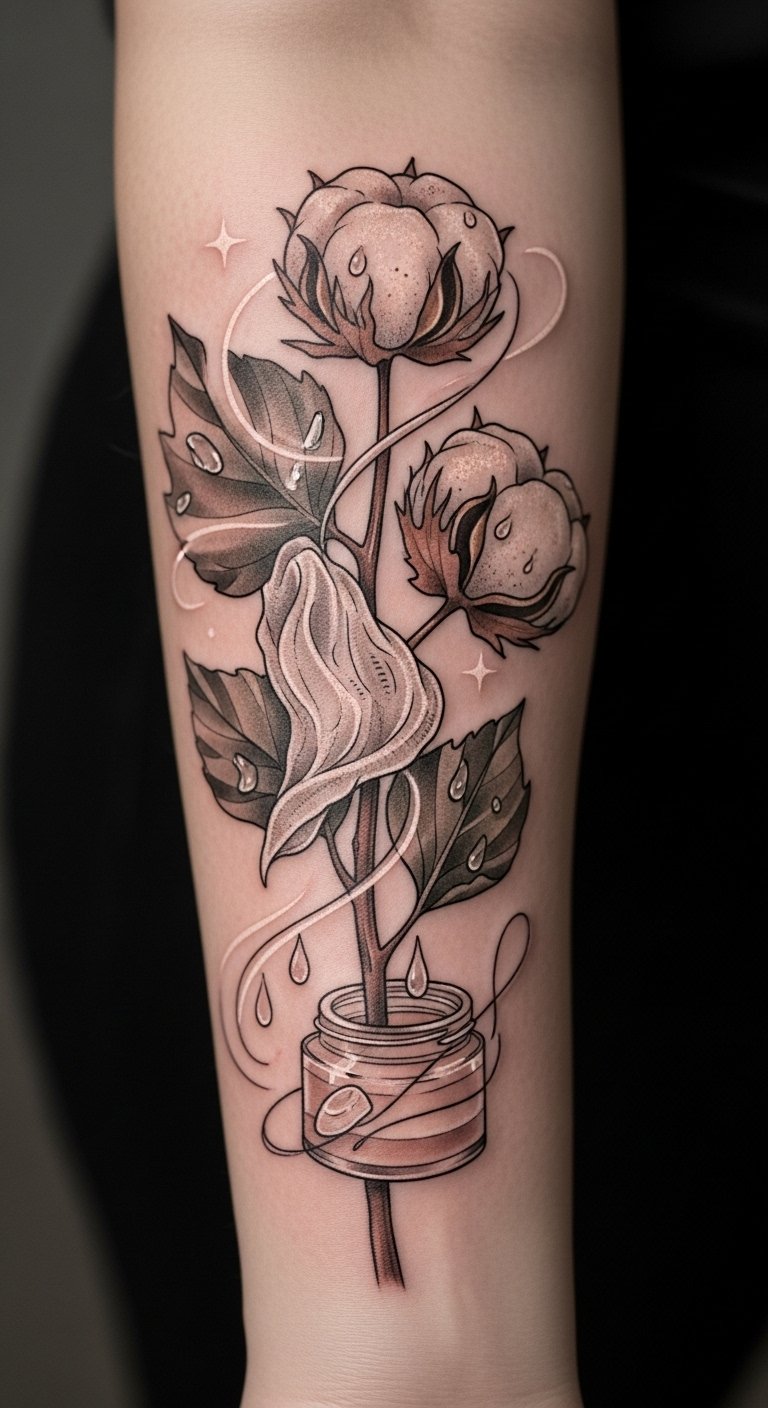 The visible moisturizer droplets and gentle skin redness evoke tenderness and the vulnerability of new beginnings. Best placed on the inner forearm, the piece reads as both a personal reminder of resilience and a celebration of art in progress, visible enough to share the story yet intimate in its ritual of aftercare.