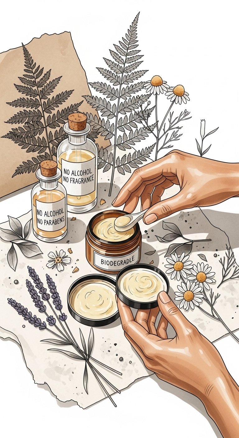 This design blends botanical imagery with natural skincare elements to symbolize protection, healing, and respect for the body. Ferns and chamomile represent resilience and soothing care, while the labeled bottles emphasize intentional, chemical-free choices—evoking calm, trust, and conscientiousness. Emotionally, it aims to reassure and empower the wearer to care for their tattoo with mindfulness. Ideal placement for the tattoo motif is on the forearm or ribcage where the curved composition can wrap gently, allowing the piece to be visible during aftercare rituals yet easily covered when desired.