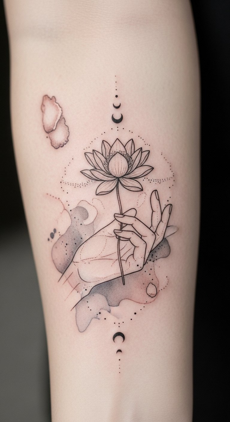 A design that visually echoes care and restraint: the closed hand cupping the lotus symbolizes protection and preservation of something precious, while the watercolor wash and stippling evoke the fragile, sensitive phase of healing.