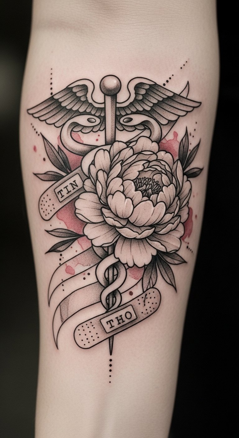 Your freedom to express yourself shouldn’t come at the cost of your health, so prioritize your well-being. The design balances medical caution and personal expression: the caduceus signals care and guidance, the peony represents recovery and resilience, and the bandage with the text embeds the exact, unaltered message as a protective mantra.