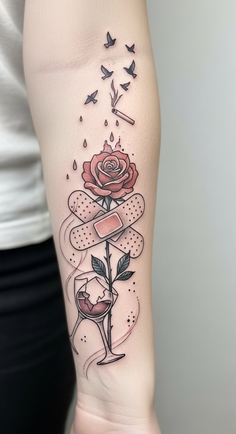 Prioritize your tattoo’s health by choosing to abstain from these habits. The design uses the bandaged rose to symbolize care and recovery, the broken wine glass and dissolving cigarette representing letting go of alcohol and smoking; the birds add a sense of release and hopeful transition.