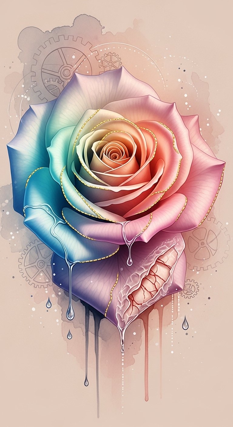 The design symbolizes patience and the natural progression of recovery: the rose represents beauty and renewal, the transitioning petals show gradual healing, gold stitching evokes care and respect for the process, and clockwork elements remind the wearer of time’s role; water droplets and watercolor wash convey cleansing and gentleness.