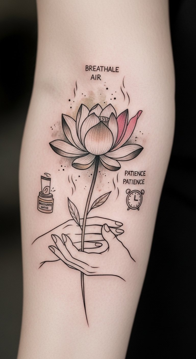 The lotus symbolizes renewal and patience, the broken ring marks progression rather than perfection, and the soft healing textures honor vulnerability and care; emotionally it communicates calm perseverance and self-compassion, ideal for inner forearm placement where you can watch and remember to respect the process.