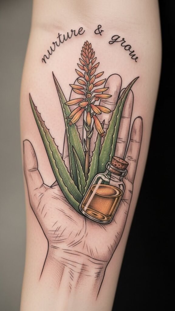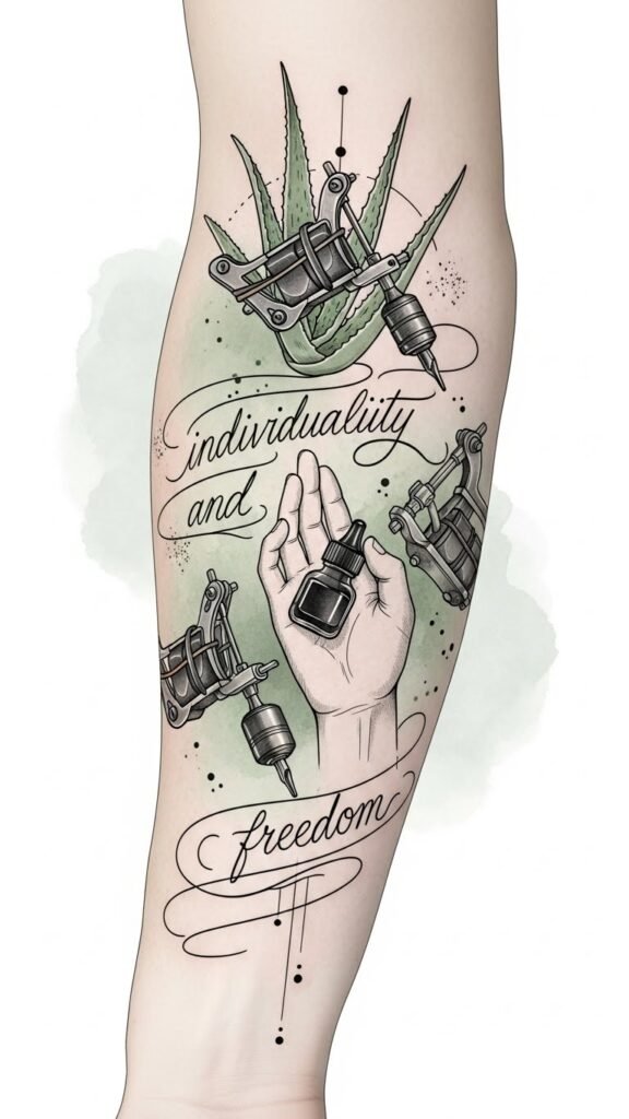 The design symbolizes the full tattoo journey: equipment and techniques represented by the machines and flowing script, healing and care shown by the aloe leaves, and personal meaning embodied in the open hand and ink bottle—an offering of creativity.