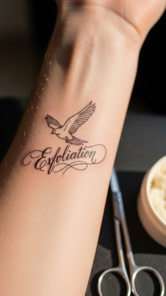 The design concept uses the prepared skin as canvas symbolism: exfoliation represents shedding the past, shaving signifies a fresh start, and the soaring bird with flowing script embodies freedom and personal voice.