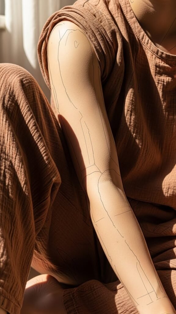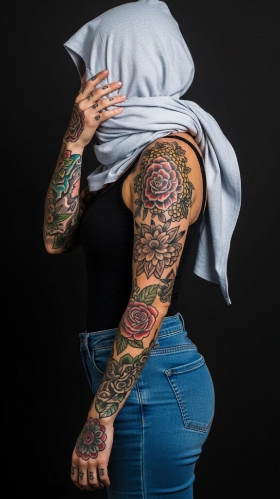 A flowing sleeve design where fabric-like bands wrap and overlap a central motif of a blooming chrysanthemum and small sun motifs partially hidden beneath translucent cloth; muted earth tones with pops of warm gold, delicate stitch-like linework, soft shading to suggest cloth texture and gentle protection. Symbolically this piece emphasizes care and preservation—cloth as shelter for the new blossom represents healing and respect for one’s art; the hidden suns nod to protection from harmful exposure while hinting at future vibrancy. Best placed on the forearm or upper arm where sleeves or clothing naturally cover it during healing, allowing the wearer to both conceal and reveal as the tattoo matures.