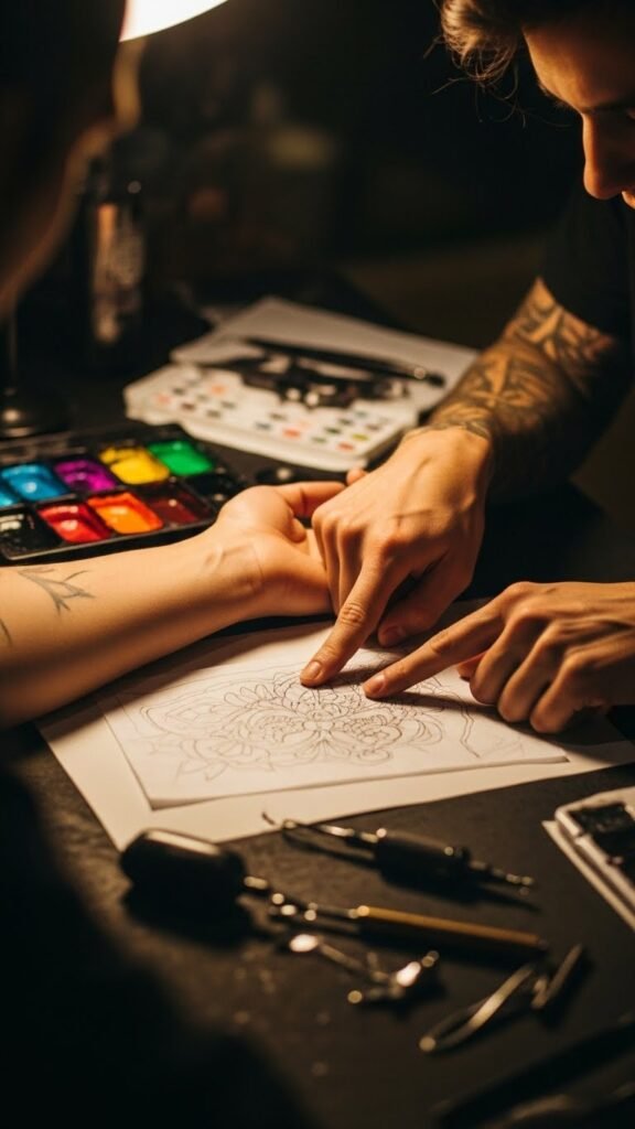 Emotionally it evokes anticipation, confidence, and creative partnership. Ideal placement for a tattoo inspired by this scene would be an area visible during consultation yet adaptable—such as the forearm, upper arm, or shoulder blade—so the final piece can be both personal and proudly displayed as a testament to the collaborative process.