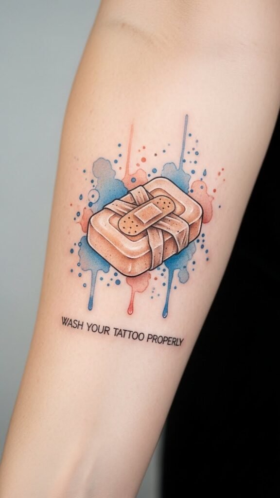 As a design this piece turns the original care instructions into a tender emblem: the wrapped soap bar symbolizes protection and healing, the lukewarm blue watercolor evokes soothing warmth and calm, and the tiny droplets and breathing lines represent cleansing and the tattoo’s need to “breathe” as it heals.