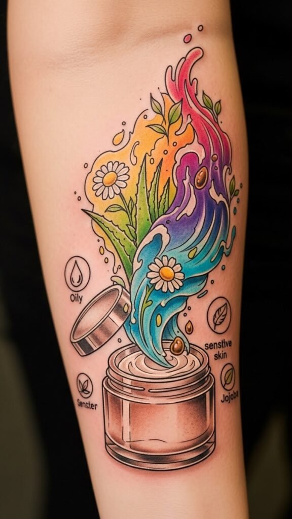 This design symbolizes care and preservation: the jar and botanicals represent natural, gentle ingredients; the flowing watercolor merging into healed ink shows the transformation from aftercare to long-term vibrancy.