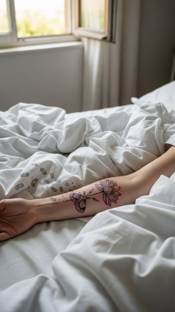 The tattoo concept uses the lotus as renewal and healing, the sleeping moth as delicate rest and vulnerability, and the fading bacteria motes to symbolize protection and purification; placed on the forearm or ribcage to be seen during quiet moments, it evokes calm vigilance and self-care, encouraging the wearer to honor their healing process with tenderness and daily rituals.