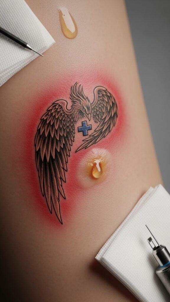 The design uses a phoenix wing to symbolize renewal and resilience, paired with a small medical cross to represent vigilance and care; the subtle redness, swelling, and fluid elements evoke the fragility of the healing process and the importance of attention.