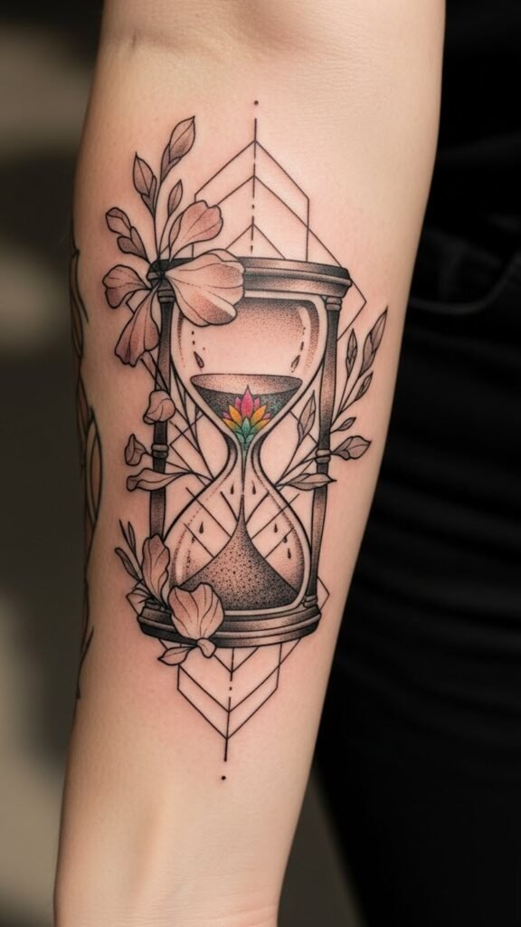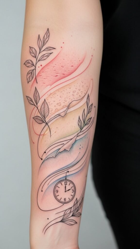 Ideal placement is along the outer forearm where the elongated composition follows natural lines, remains visible for self-reminders of care, and adapts easily to both color and blackwork tattoo styles.