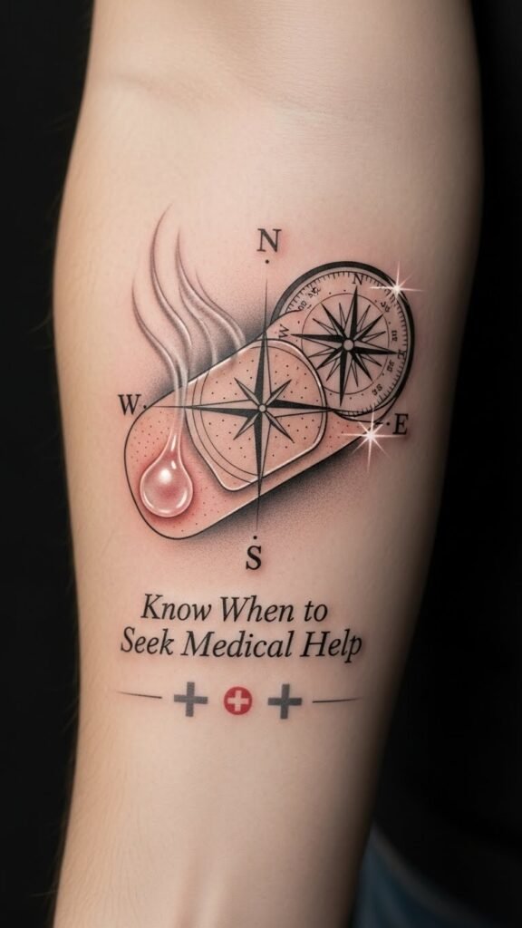How the design works: The realistic healing patch visualizes the boundary between normal recovery and danger, with the compass rose symbolizing guidance and the small red cross as a discreet cue to seek help. The clear bead and heat shimmer evoke urgency without sensationalism, expressing concern and self-care rather than alarm. Placing it on the forearm makes it easily visible to the wearer and clinicians, serving as both personal reminder and a conversation starter about health; the calm serif script grounds the message in clarity and personal agency.