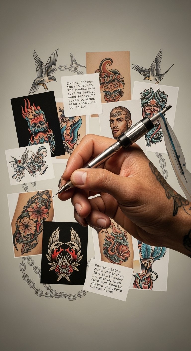 This design concept symbolizes the lifelong commitment of tattooing—precision and care (the artist’s hand and fine-line needle), the breadth of artistic identity (portfolio snippets), and the community’s voice (testimonials).