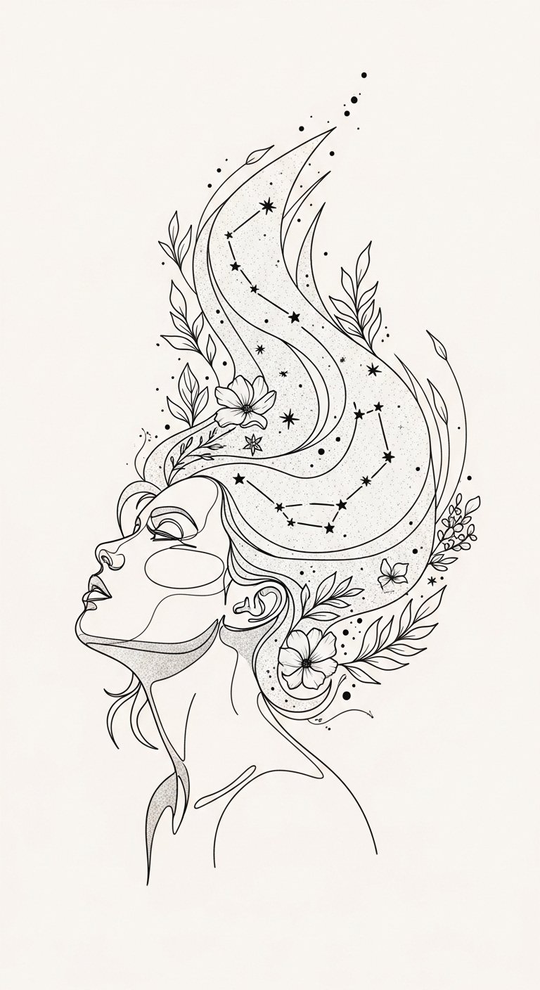 This design blends celestial and botanical symbolism to evoke guidance, growth, and personal transformation; constellations suggest destiny and navigation, while the plants signify resilience and renewal, creating an emotional balance of introspection and hope.