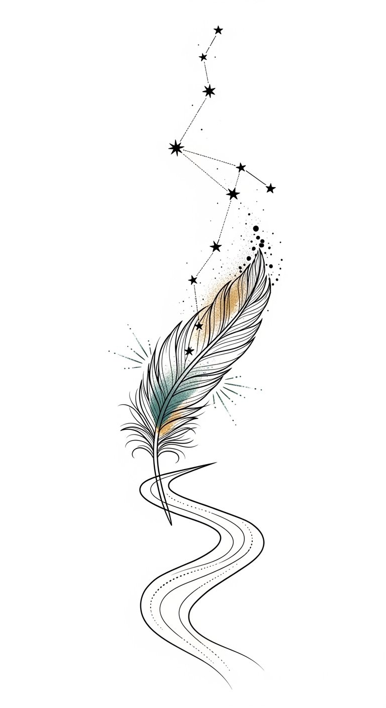 The river-feather-constellation concept symbolizes personal journey (river), freedom and identity (feather), and aspiration or guidance (constellation).