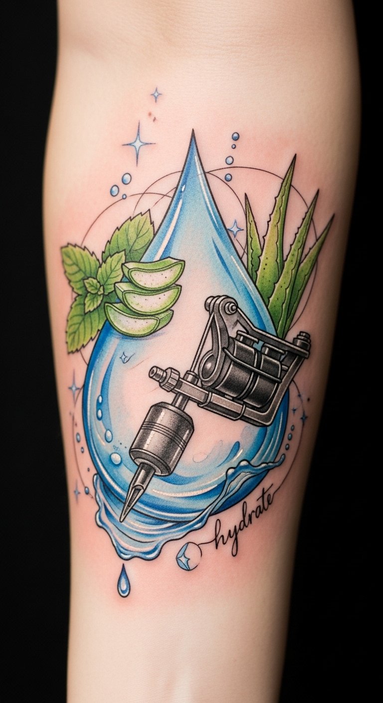 The design symbolizes the relationship between hydration and tattoo health: the water droplet embodies life and renewal; the tattoo machine represents the art being preserved.