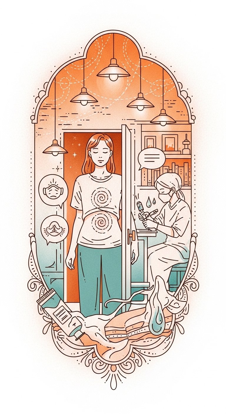 A delicate, flowing tattoo concept that visually interprets ritual and preparation: a stylized path of footprints leading to a small, open studio doorway framed by soft botanical motifs (aloe, calendula) and a subtle sun motif fading at the edges; along the path, icons of a calendar, a friendly conversation bubble, and a water droplet remind of consultation, discussion, and hydration; palette is warm neutrals with muted gold highlights to convey care and empowerment. Symbolically the design speaks to intentionality and respect for the body—each element evokes the emotions of calm readiness, trust between client and artist, and the protective, preparatory rituals that make a tattoo meaningful; ideal placement is along the forearm or ribcage where the flow of the path complements natural contours and the piece can be both seen and covered as chosen.