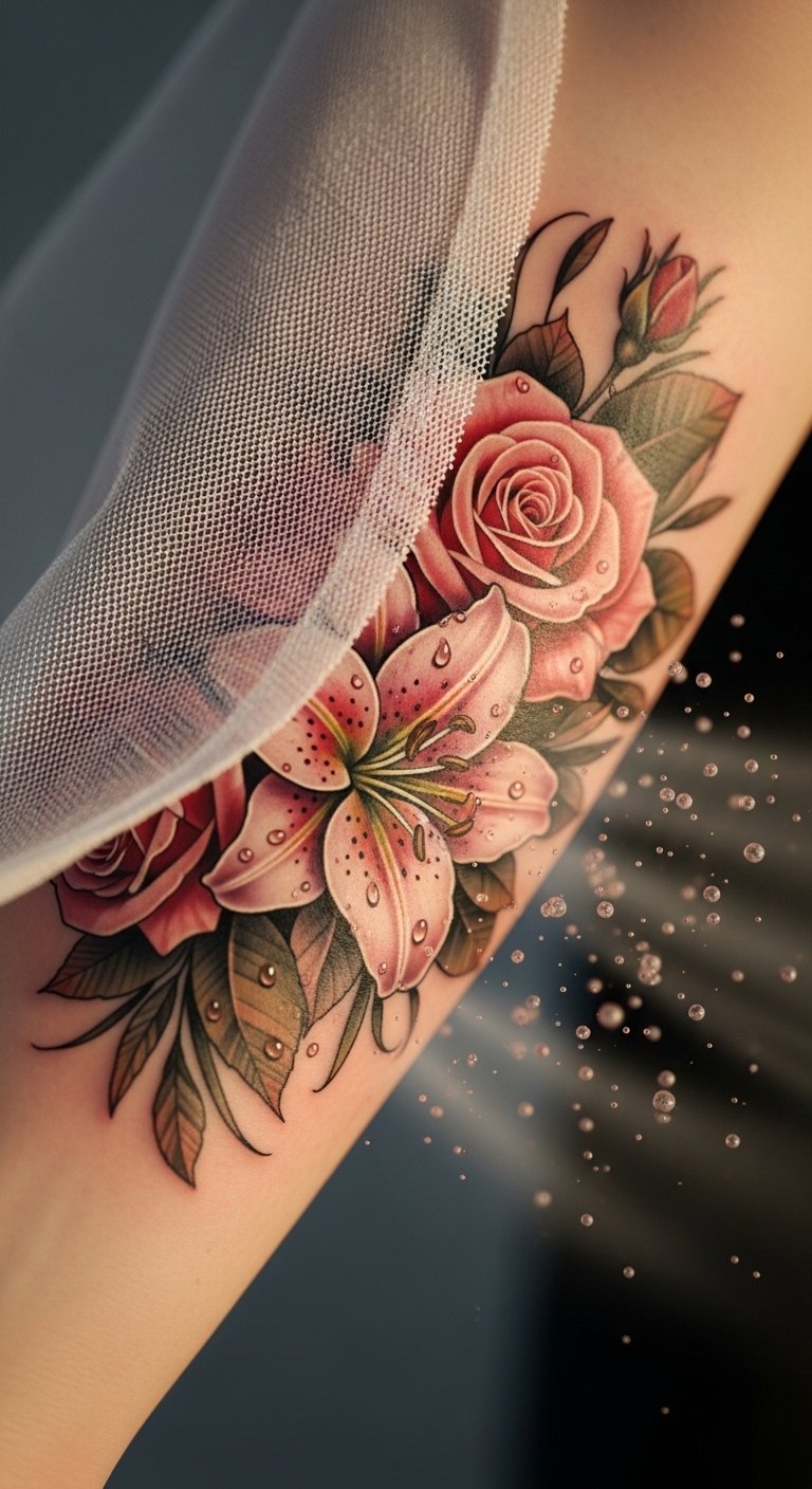 The design symbolizes the balance between protection and vulnerability: the translucent veil represents the initial care and barrier that shields fresh ink, while the blooming flowers beneath signify the art’s life and long-term beauty.