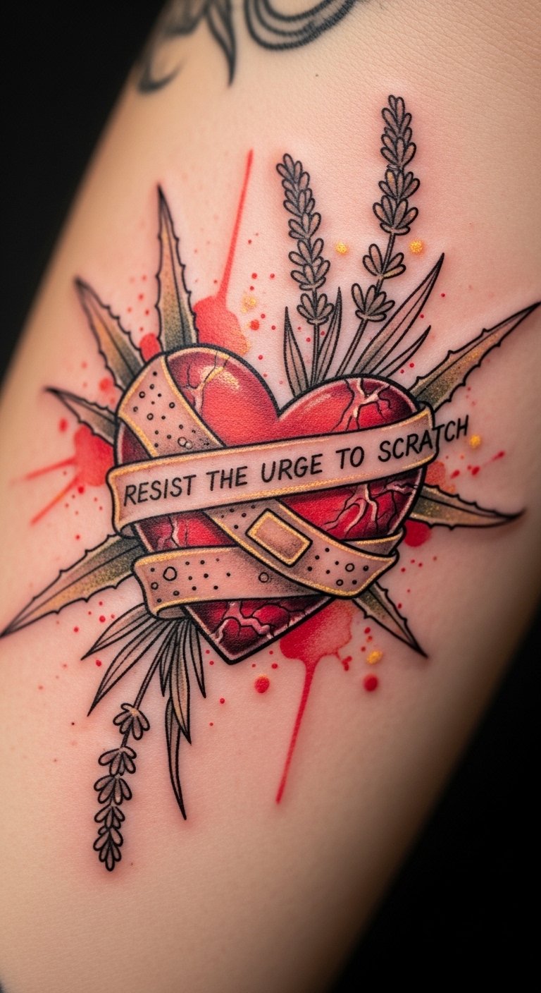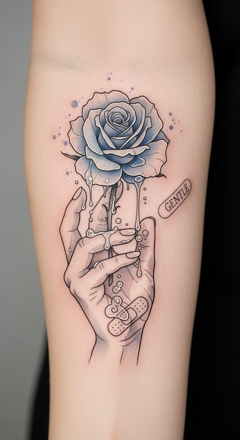 Emotionally, it conveys tenderness, patience, and respect for one’s body and artwork. Best placed on the inner forearm where it can be easily seen and tended, the image serves as a personal reminder to treat new ink with softness and mindful attention.