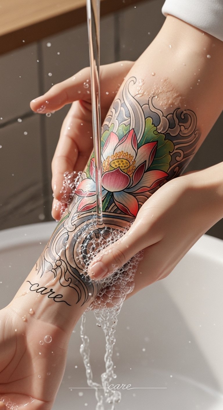 The concept uses the act of washing a healing tattoo as a metaphor for ongoing care and respect: the lotus symbolizes rebirth and purity, the flowing ink lines represent the continuity of the wearer’s story, and the visible healing texture emphasizes resilience.