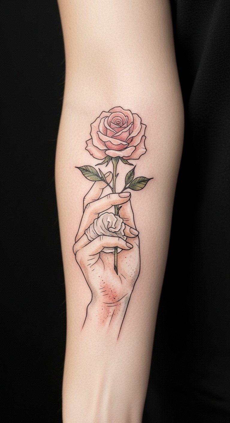 A delicate, small-to-medium tattoo design that visually interprets the care and gentleness described: a soft, semi-realistic hand holding a folded, plush towel beneath a newly inked, flourishing floral sprig whose petals show tiny dew-like highlights; faint, airy lines around the flowers suggest breathable space and light, while a subtle shield or halo behind the composition symbolizes protection and preservation. The palette is muted pastels with warm skin tones and a gentle sheen to imply freshness. This piece evokes tenderness, careful attention, and reverence for the body’s healing process—ideal on the inner forearm, upper chest near the sternum, or along the ribcage where the wearer can both see and honor the ritual of attentive aftercare.