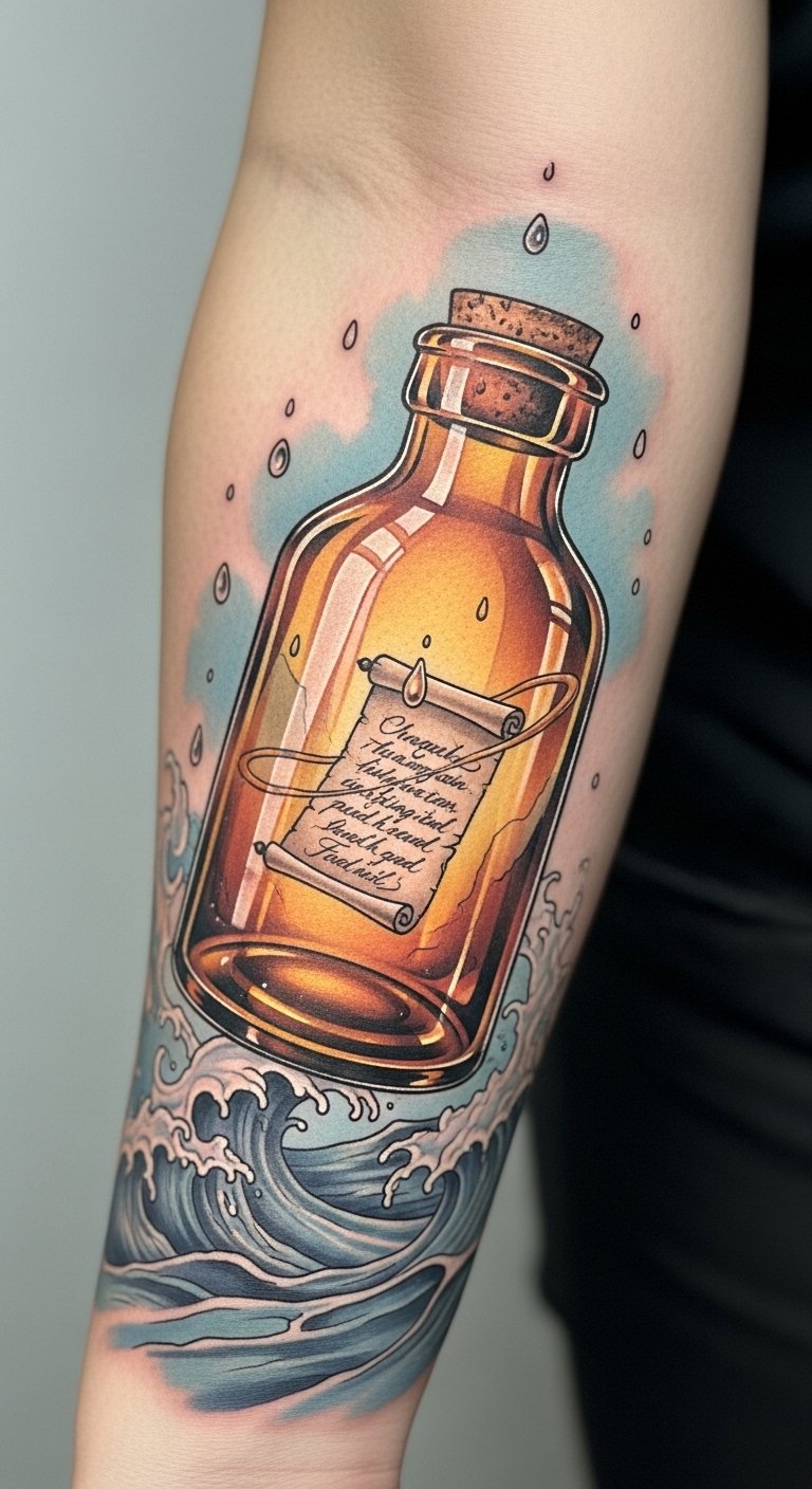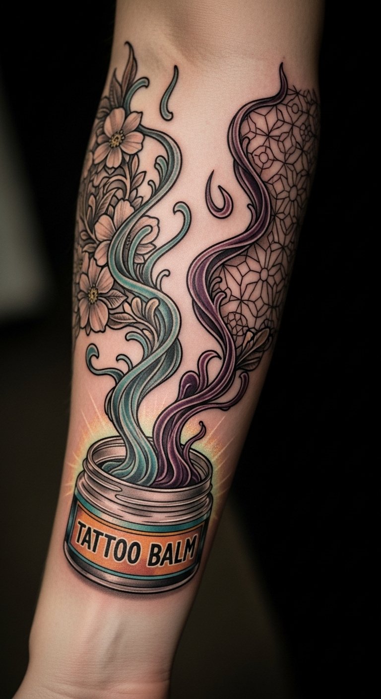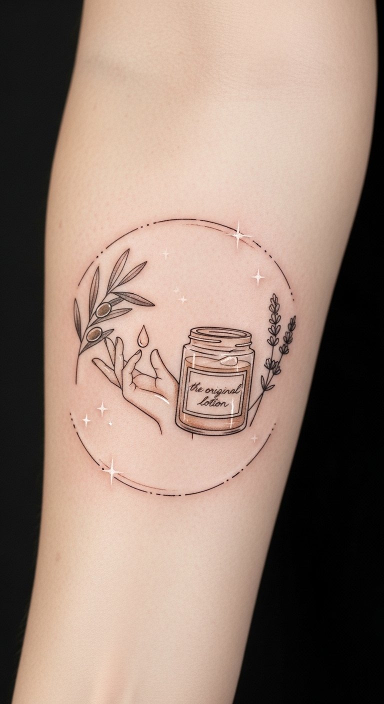 Emotionally it balances pride in one’s ink with gentle self-care, encouraging ritual and respect for the body. Ideal placement is the outer forearm where the act of applying can be seen and repeated easily, serving both as a reminder and a visually appealing statement piece.
