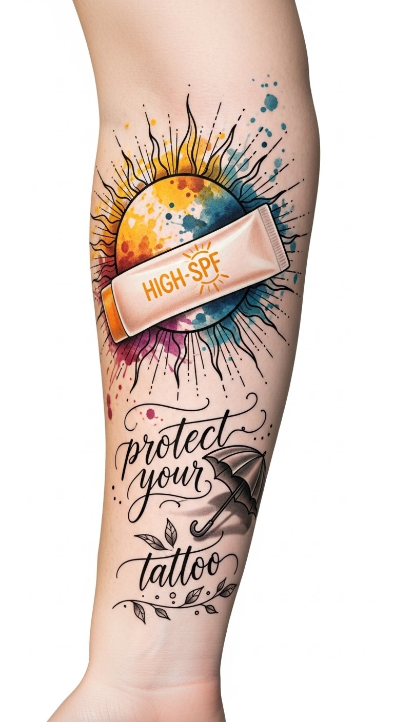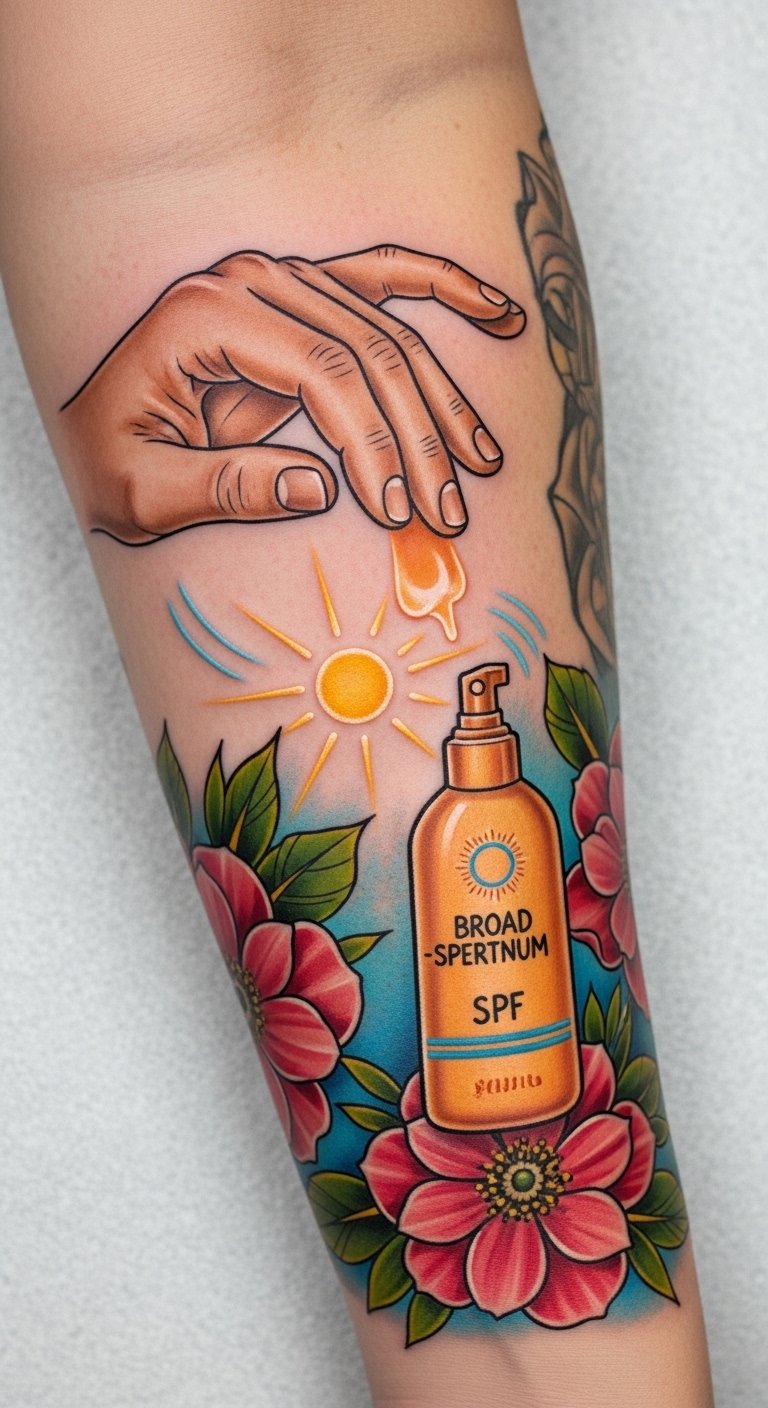 This design symbolizes care and preservation: the hand and sunscreen bottle represent intentional, daily protection, the healed floral tattoo signifies beauty worth maintaining, and the sun with protective rays flips the usual threat into a guardian element.