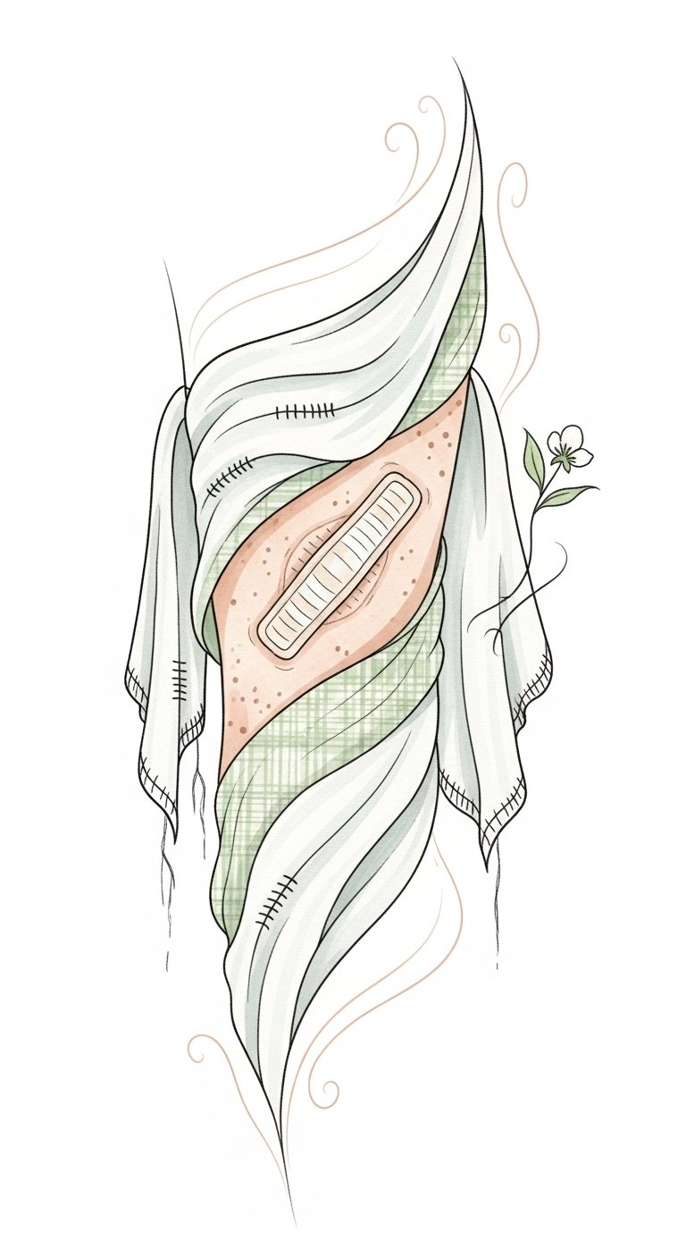 Botanical elements (mint and aloe) evoke soothing aftercare and natural healing, while geometric rings hint at skin elasticity and resilience. Emotionally the piece balances care and anticipation—comforting, hopeful, and proud.