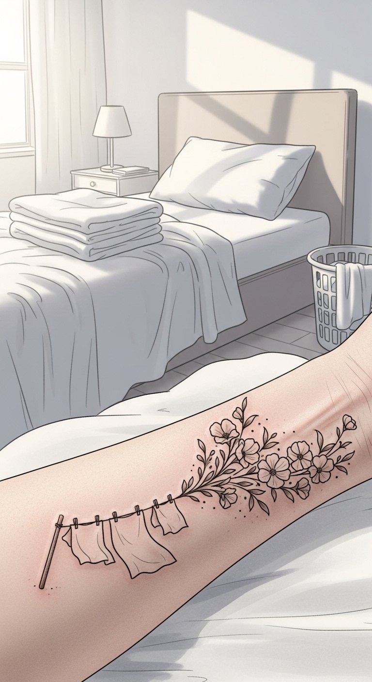 The design ties the domestic ritual of laundry to skin care, using the washing line and miniature sheets transforming into flowers to symbolize protection, renewal, and growth; the bedroom backdrop and morning light convey calm, routine, and gentle care, making the forearm an ideal placement where the wearer can easily see and mindfully tend to both tattoo and habits.